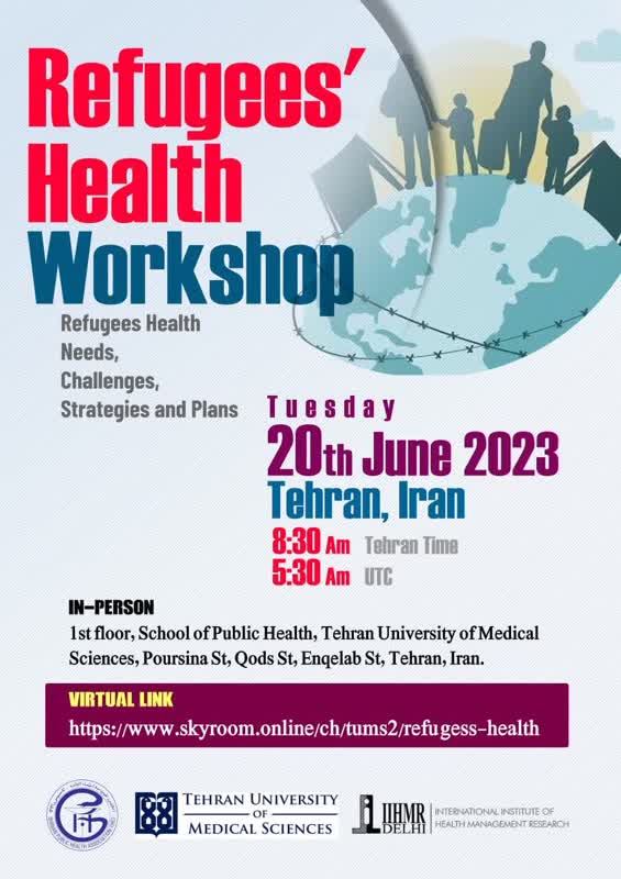 دپارتمان سلامت در حوادث و بلایا دانشگاه علوم پزشکی تهران با همکاری انجمن علمی بهداشت ایران و موسسه بین المللی تحقیقات مدیریت سلامت دهلی هند به مناسبت ۲۰ ژوئن روز جهانی پناهندگان، کارگاه سلامت پناهندگان را با مشارکت اساتید صاحب نظر داخلی و خارجی و نمایندگان سازمان های بین المللی ذی نقش در سلامت پناهندگان در مورخ ۳۰ خرداد ۱۴۰۲ از ساعت ۸:۳۰ الی ۱۳ به صورت حضوری و مجازی و به زبان انگلیسی برگزار می نماید.